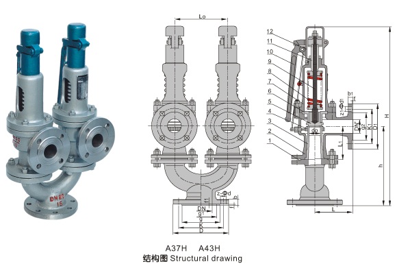 Type A38Y, A43H, and A37H double safety valves are constructed by installing two A48Y or A47H safety valves of the same specification on the Y-joint. The nominal diameter series refers to the inlet diameter of the Y-joint. The combination of these two safety valves is as follows: