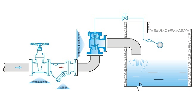H142X液壓水位控制閥是一種自動控制水箱、水塔液面高度的水力控制閥。當(dāng)水面下降超過預(yù)設(shè)值時,浮球閥打開,活塞上腔室壓力降低,活塞上下形成壓差,在此壓差作用下閥瓣打開進行供水作業(yè);當(dāng)水位上升到預(yù)設(shè)高度時,浮球閥關(guān)閉,活塞上腔室壓力不斷增大致使閥瓣關(guān)閉停止供水。