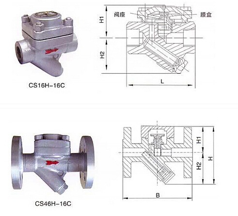 CS16H、CS46H膜盒式蒸汽疏水閥(蒸汽壓力平衡式)是目前 上常用的新型節(jié)能型疏水閥。膜盒式蒸汽疏水閥的反應(yīng)非常靈敏,工作時閥前存有高溫凝結(jié)水,無蒸汽泄漏,節(jié)能效果顯著。
